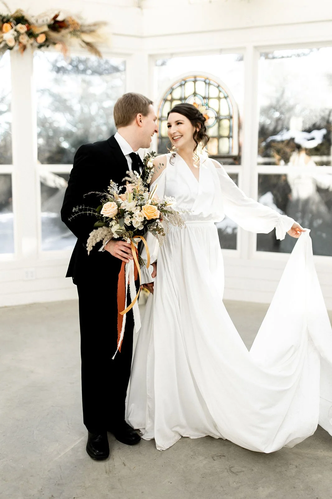 We just love this modern minimalist styled elopement planned and photographed by L.E. Photo Design. One of our favorite things about the Conservatory is that it doesn’t even need to be decorated to be beautiful. You can put together an incredibly gorgeous minimalist wedding day in our space by simply taking advantage of Iris Aisle’s unique features, like the ornate stained glass, our hanging and potted plants around the venue (even in winter), and the bright natural light inside the Conservatory, not to mention the perfect nature views in every direction, like our cedar grove that’s right out of a fairy tale. Adding a few simple floral arrangements will make the space all your own, or skip decorating entirely and enjoy the beauty that already exists here.